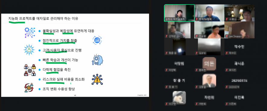 (비대면) 10월 세미나 페이지 정보 작성자 관리자 작성일25-10-22 10:23 조회45회 댓글0건 관련링크 다음글 목록 본문 10월 21일(화) '지능화 프로젝트를 위한 애자일'을 주제로 온라인 세미나를 시행하였다. (강사: 김정수 네오원 대표) 댓글목록 등록된 댓글이 없습니다. 다음글 목록